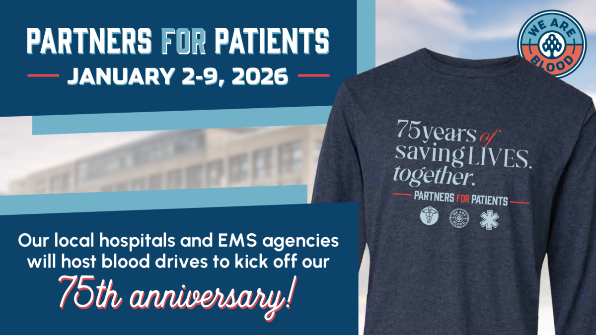 To celebrate 75 years of saving lives together and start the new year strong, We Are Blood is hosting Partners for Patients between January 2-9, with special blood drives at partnering healthcare facilities across Central Texas. By donating blood at a participating location, you can give patients in our community the chance to receive life-saving care when they need it most.